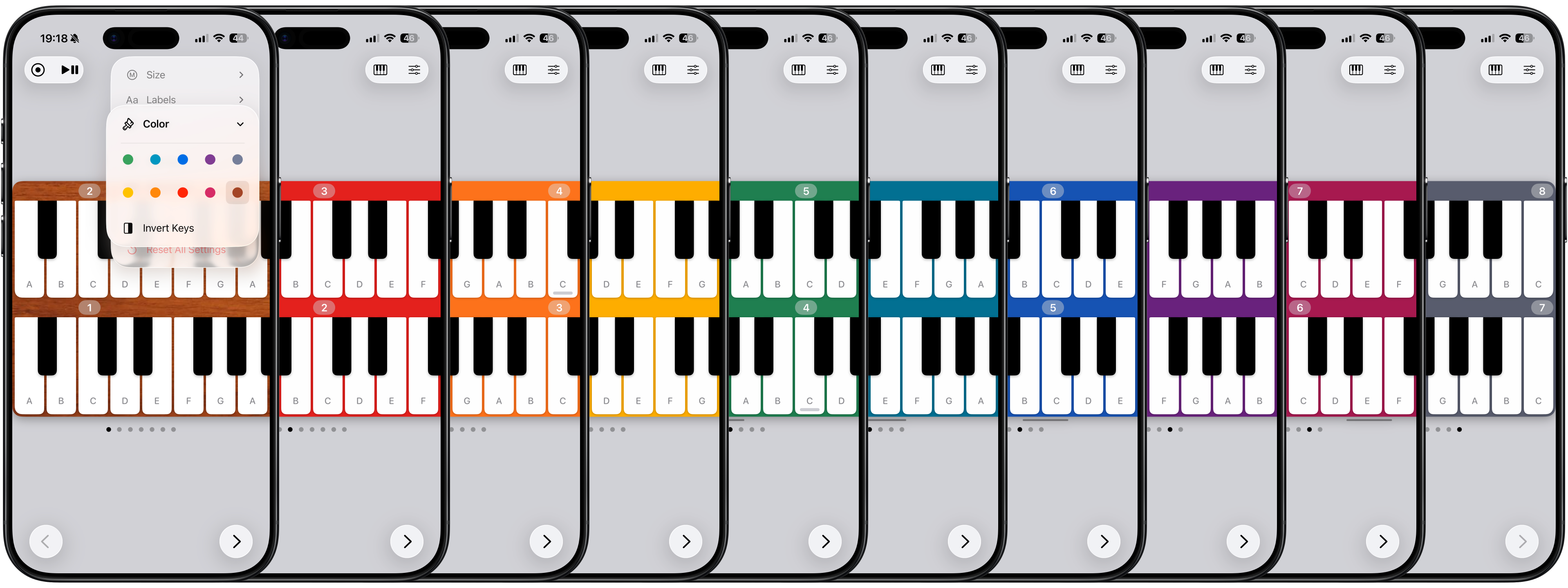 MultiPiano: a scrollable stack of layered pianos with a unified body.